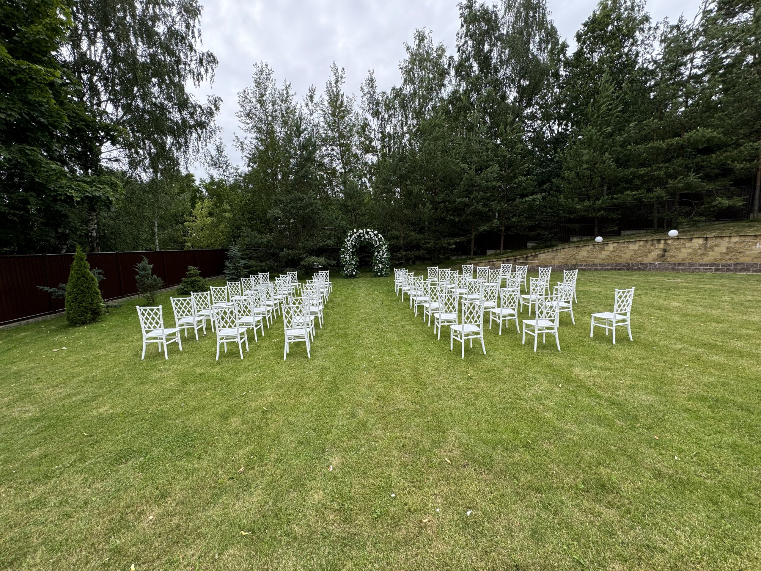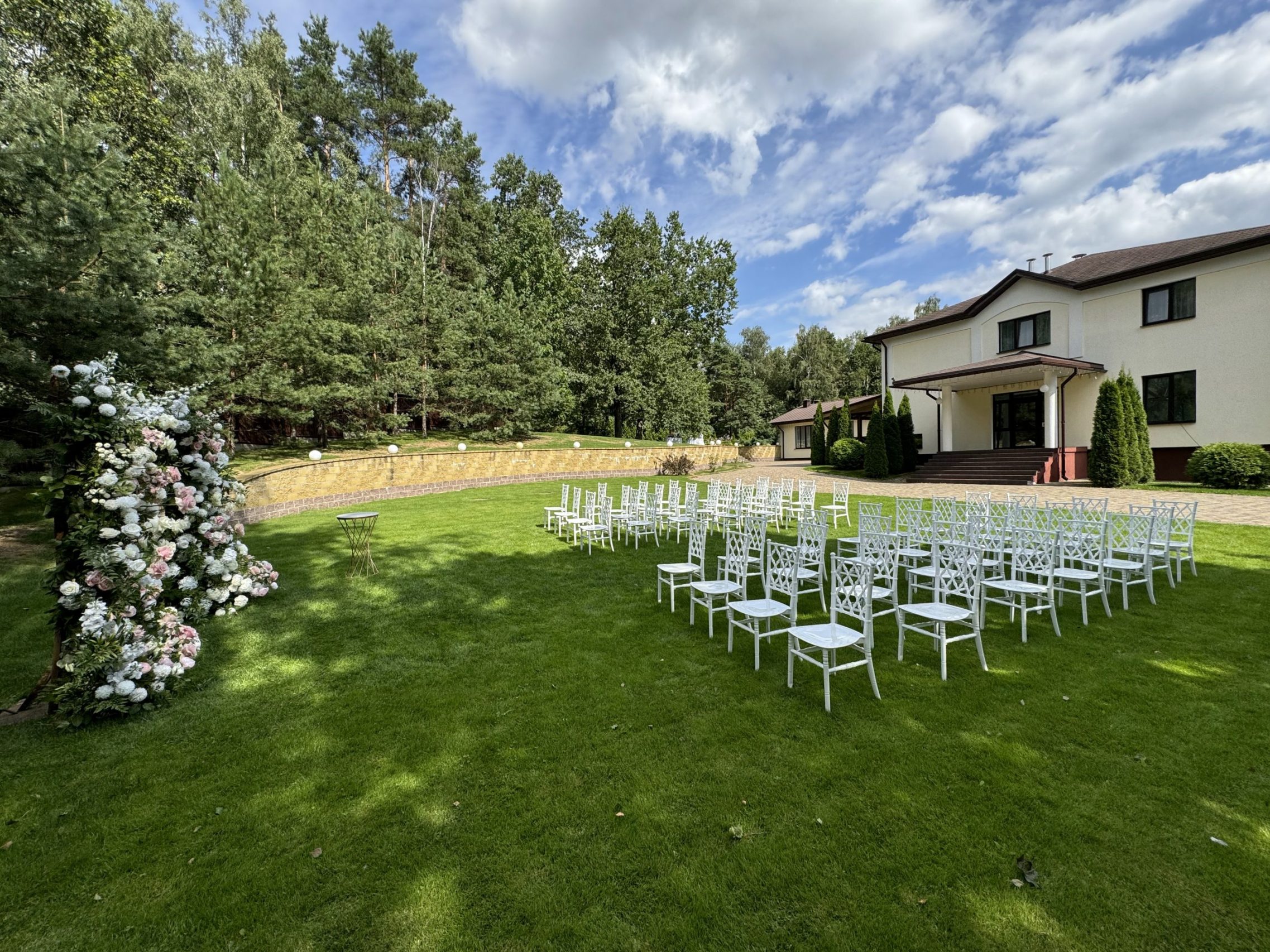 Просторная лужайка и летняя терраса с живописным видом на лес создают идеальные условия для выездной свадебной церемонии, придавая вашему празднику особую романтику.